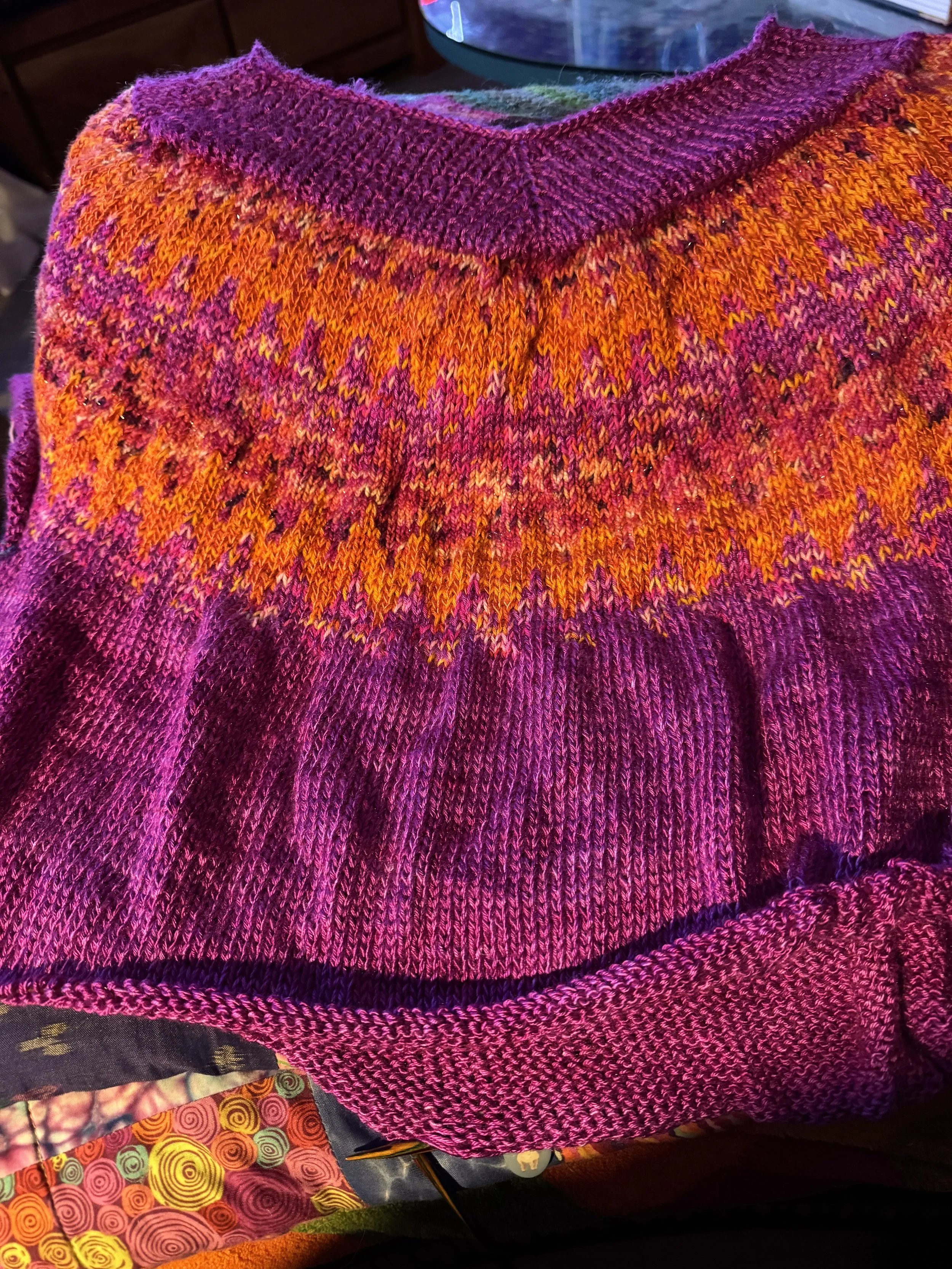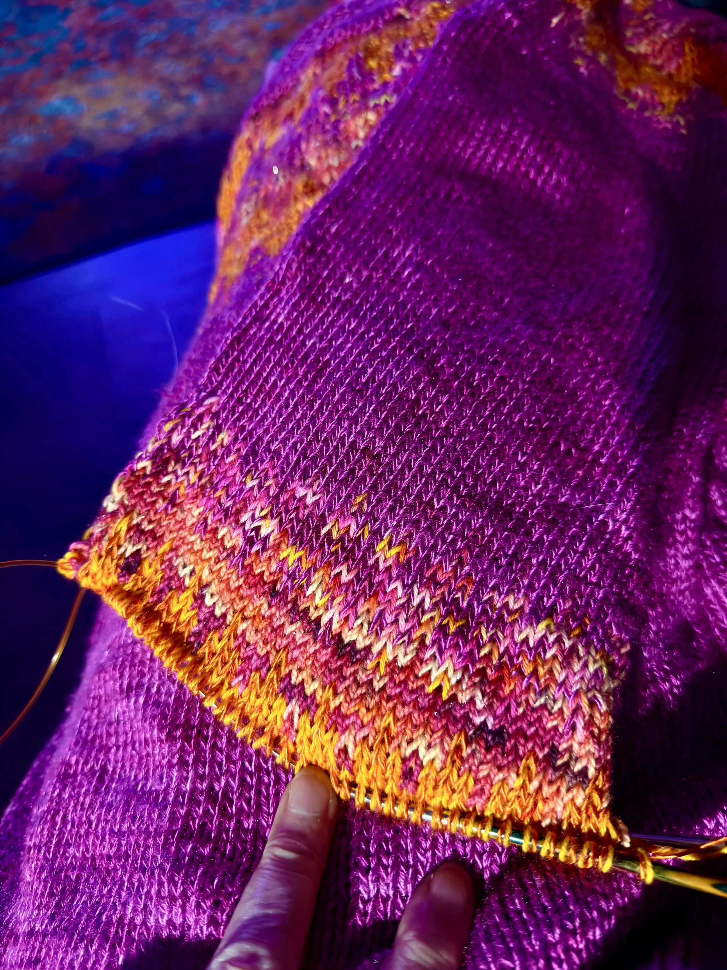 I wasn’t 100% happy with the definition of the pattern round the sleeves. The first few rows of the zig-zag pattern were being done with one strand of the pink silk, and one of the variegated yarn from Mothy and the Squid. I figured that it might look better to ditch the pink silk and use two strands of the variegated yarn instead.