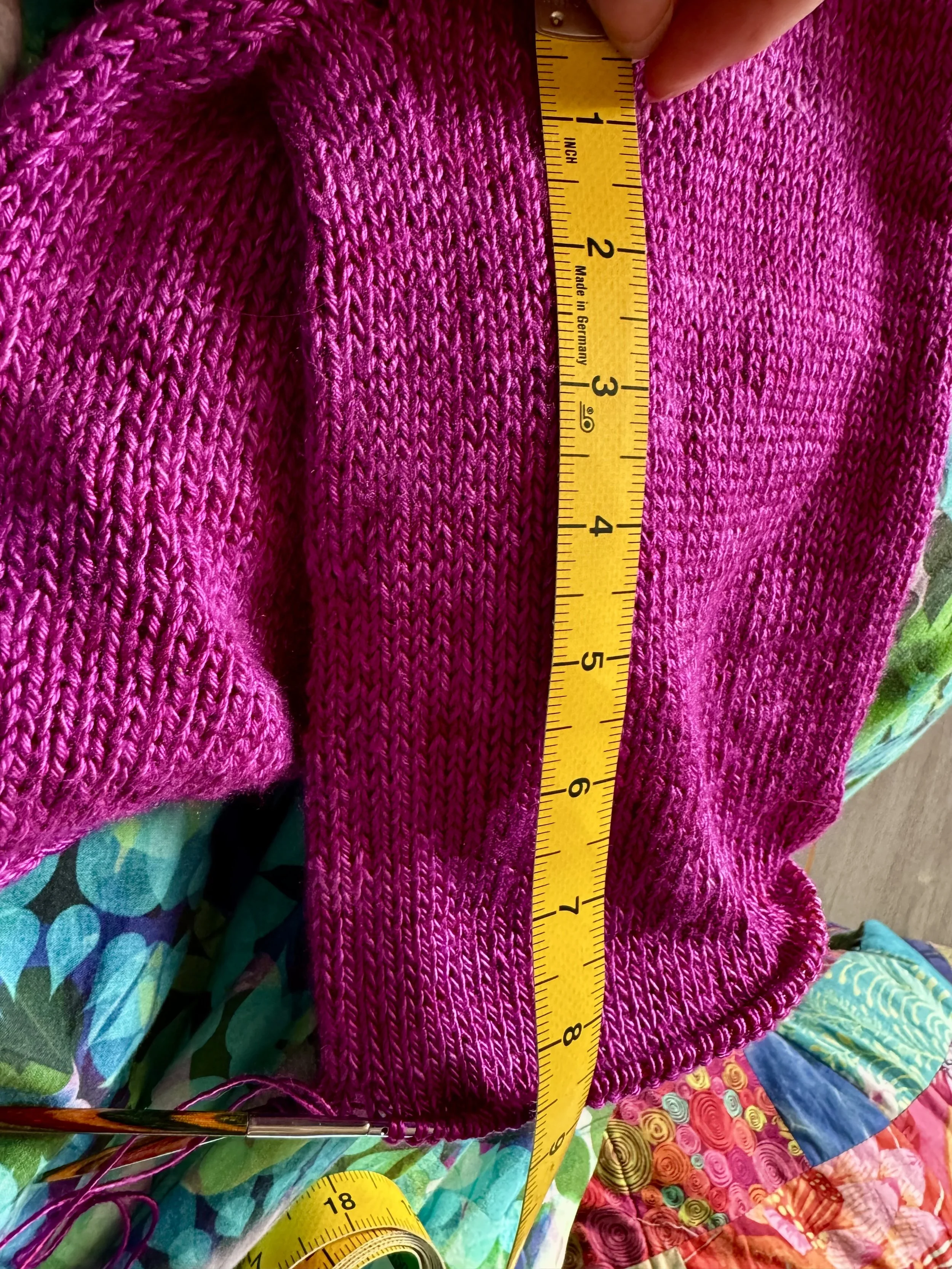 Another month passed, and it was the middle of August before even the first sleeve was long enough to start on the pattern at the cuff. I was out with the measuring tape every evening to see if it had magically grown by a few inches, but eventually I got there.