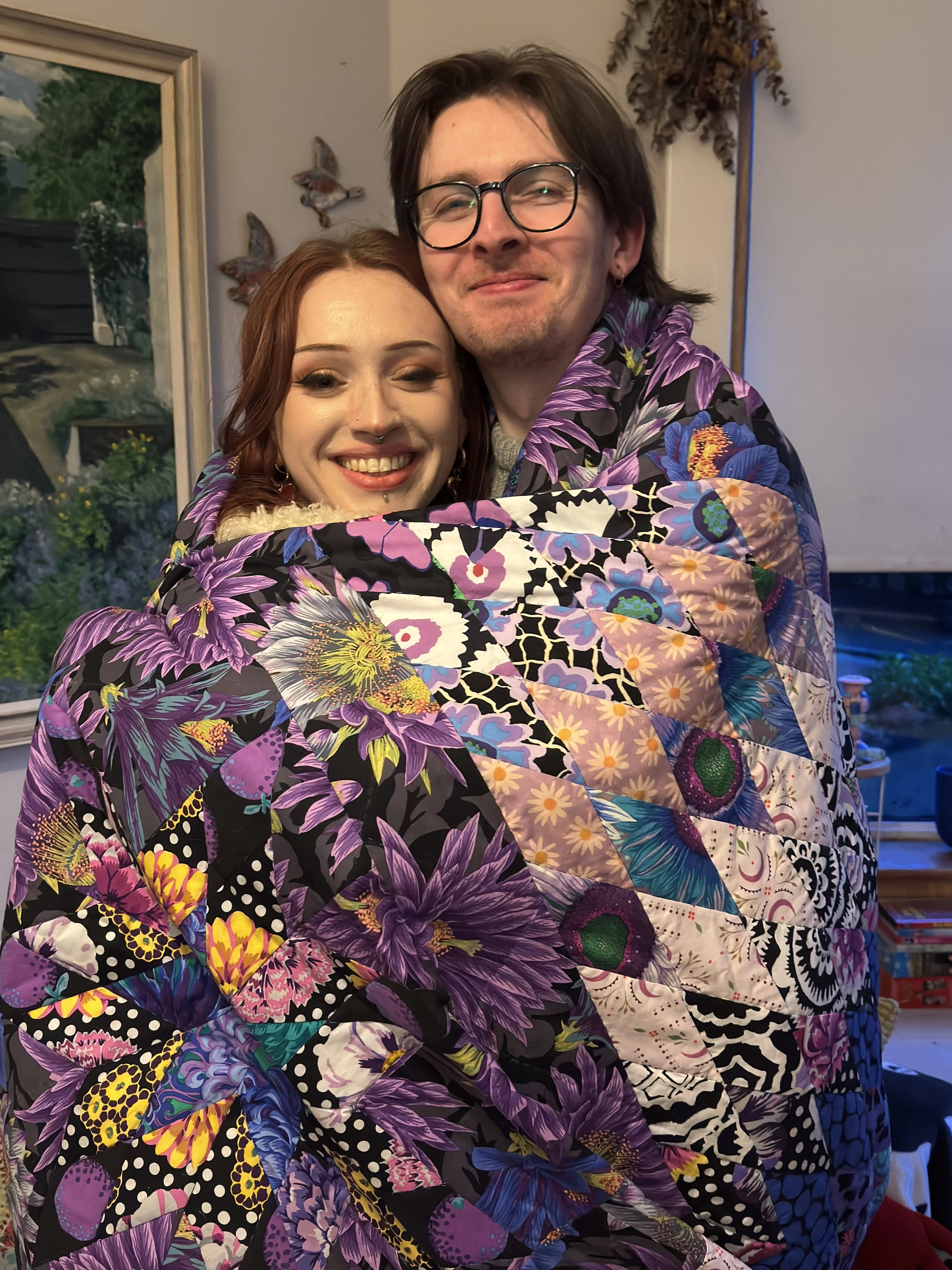 There is a unique kind of magic in handing over a handmade gift, especially one that has been so lovingly and carefully curated. Watching Marc immediately wrap himself in the fabrics he’d picked almost a year ago made every late night worth it. It’s no longer just a pile of fabric and batting—it’s a warm welcome into the family, a true heirloom piece.
